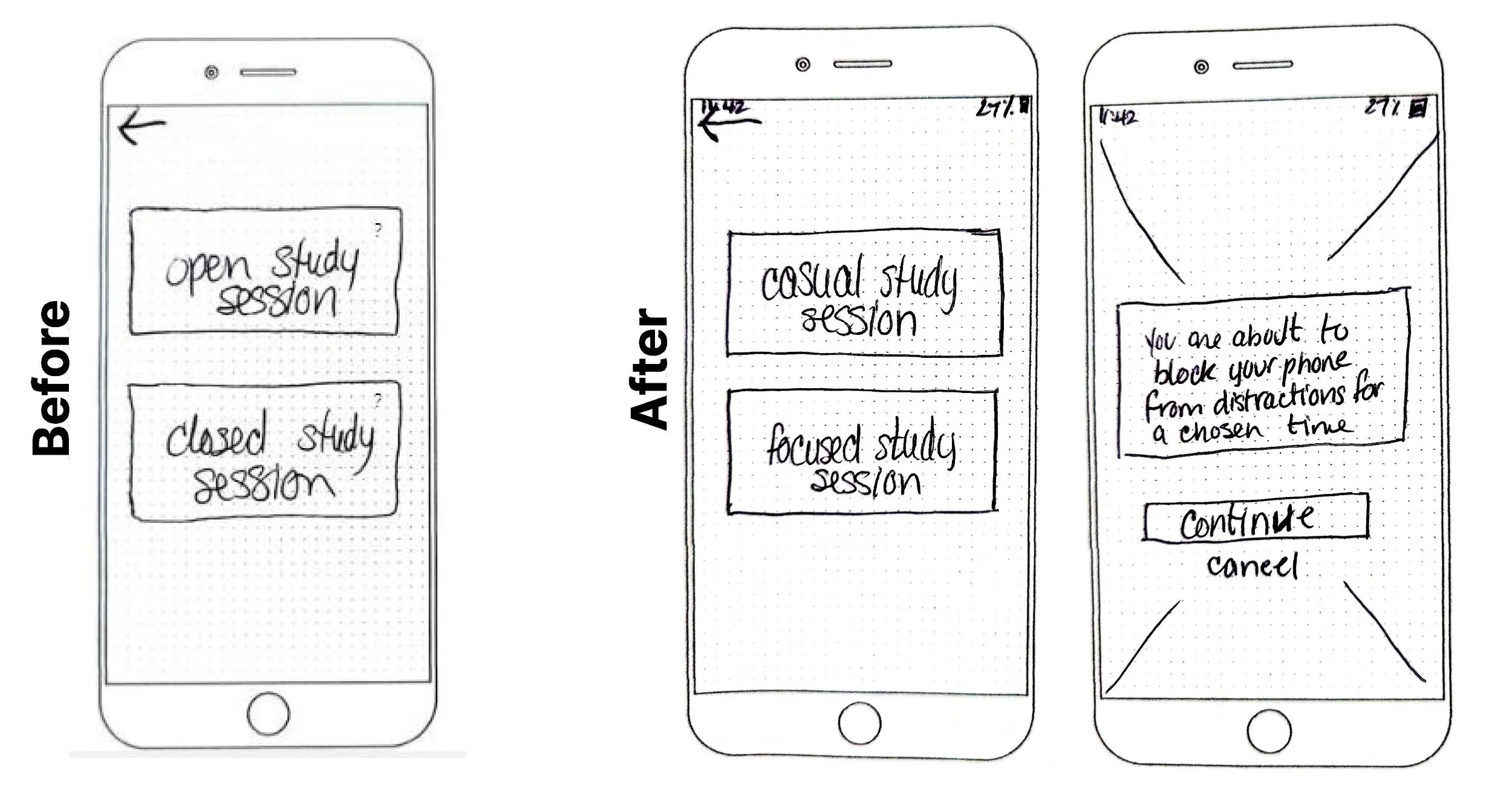 Here I followed the recommendations and changed the wording from open study session to casual study session and from closed to focused. Then I added a warning screen to give an opportunity to the user to confirm their choice.