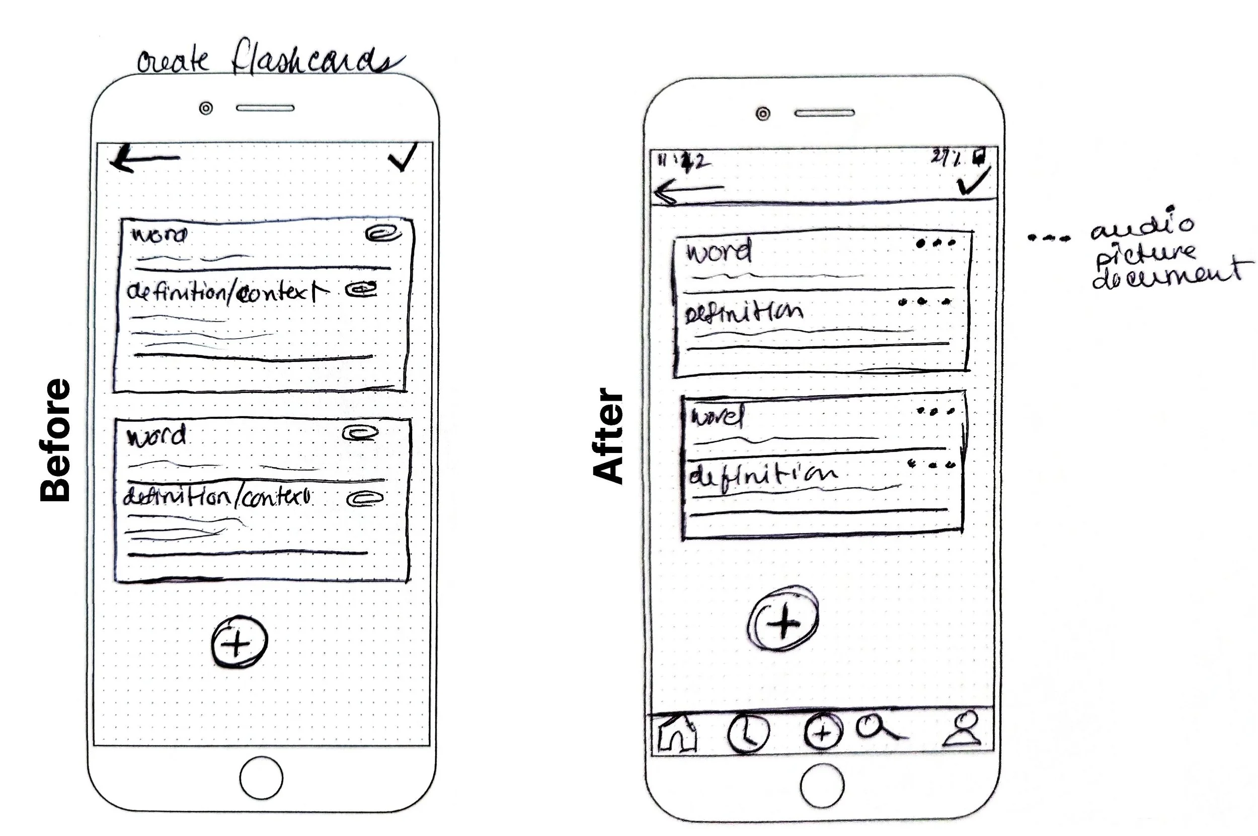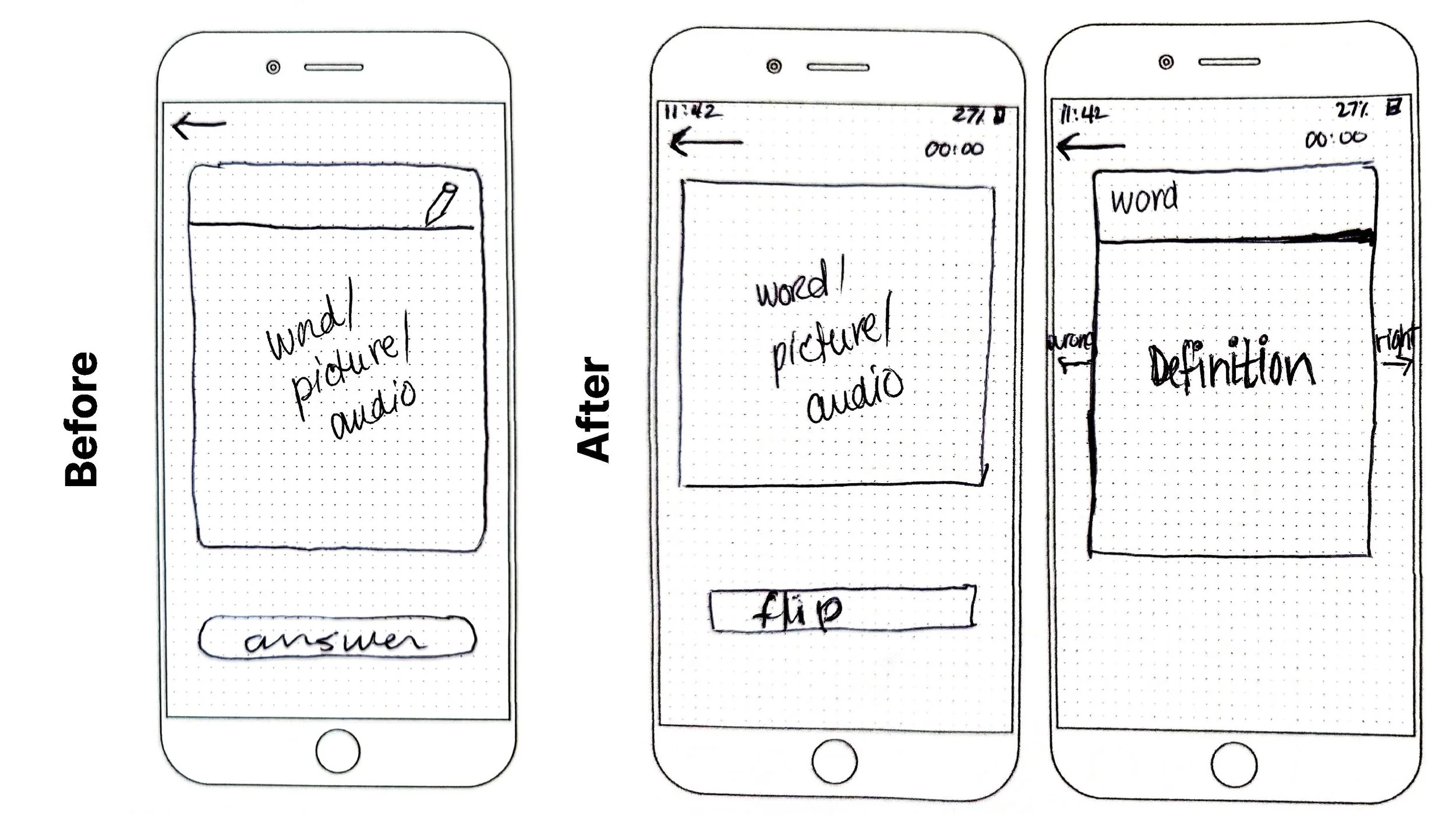 As recommended, I changed the word “answer” to “flip” as it was confusing for many users and it’s more representative of what we do with physical flashcards. I also removed the pencil but I would like to test this feature again, what if the user realizes that there is a mistake in the definition or wants to add precisions? I also added the word with above the definition.