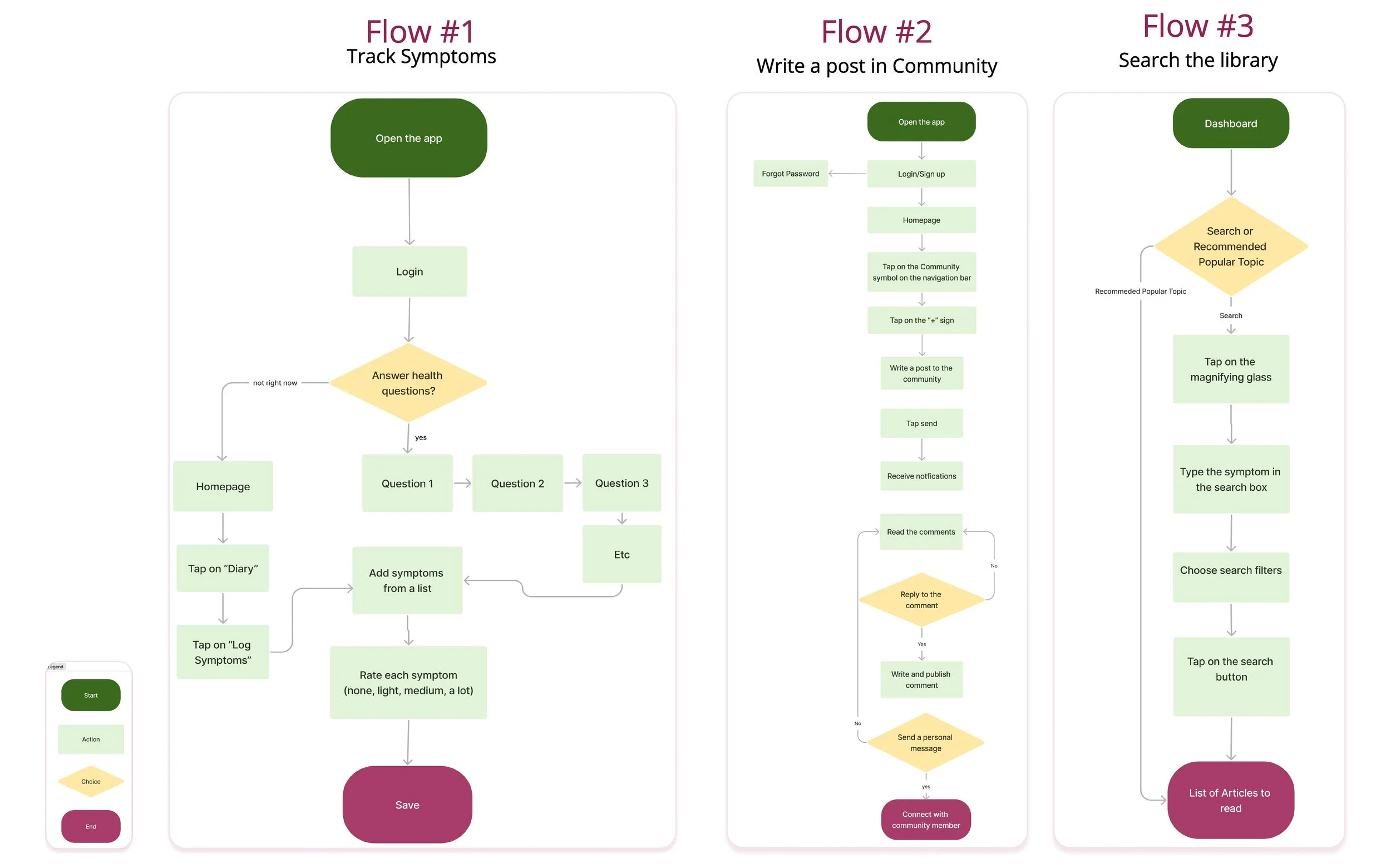 I developed two distinct user flows that aimed to satisfy these requirements. However, I also recognized that many users may not be fully aware of what they need to manage their perimenopause symptoms effectively. This realization inspired me to create a third user flow: