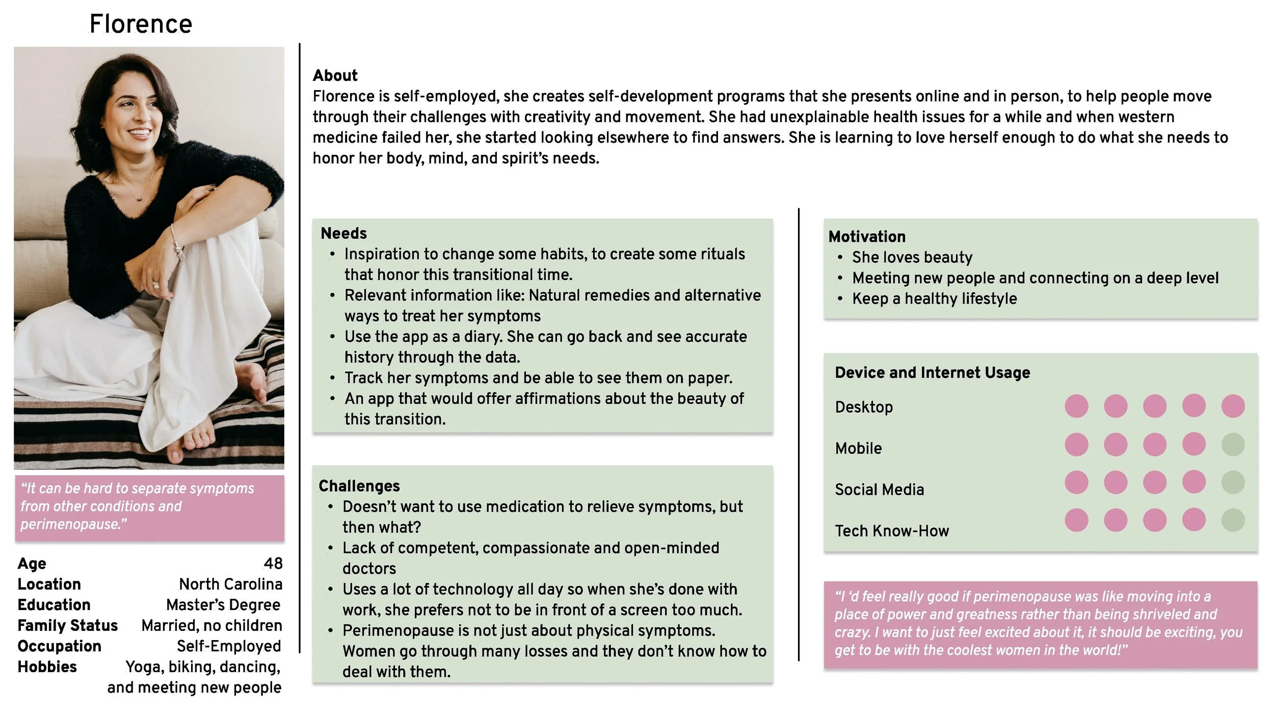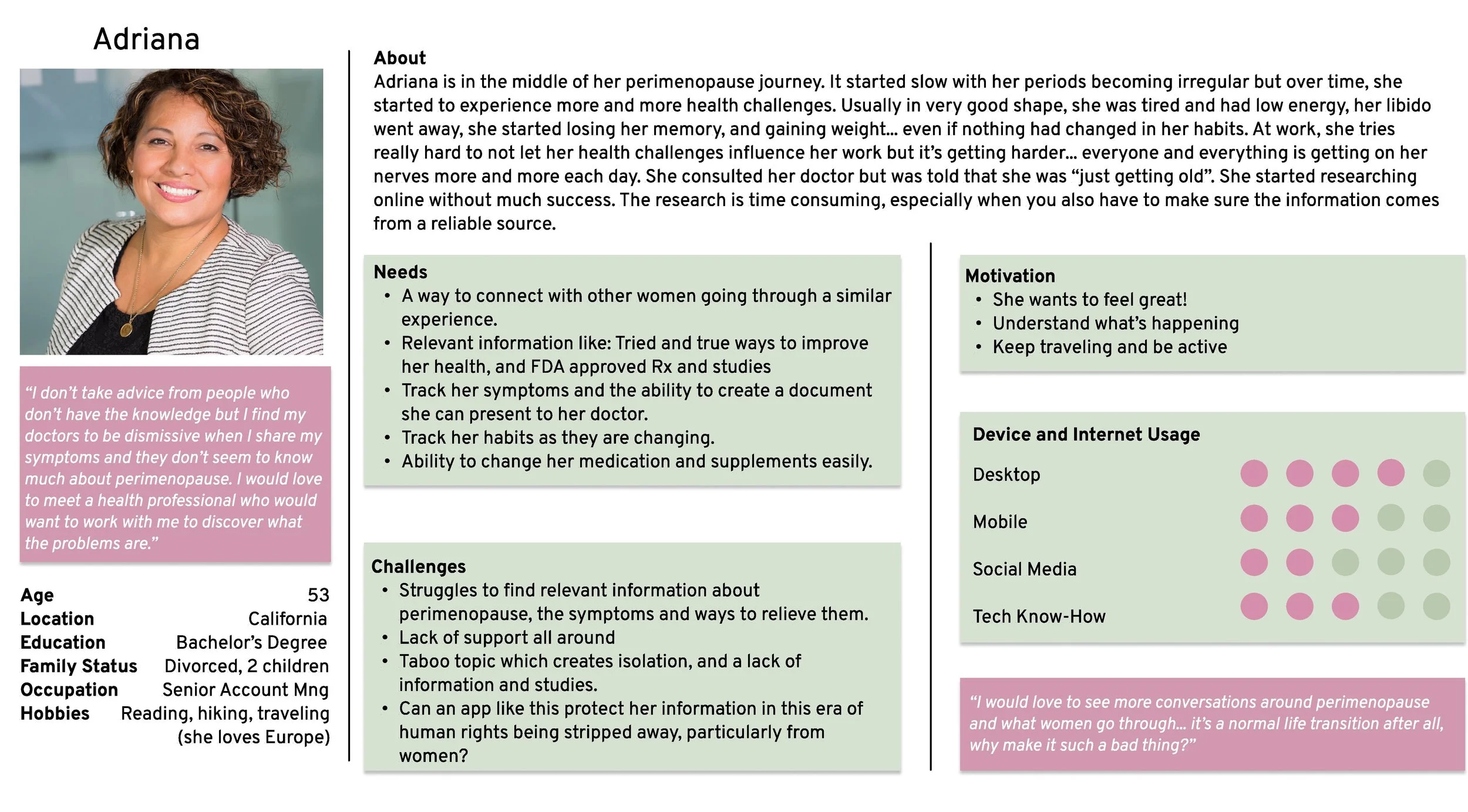 I’ve interviewed 4 women between 42 and 45 year old who are going through perimenopause. What I learned was unexpected and revealing of their challenges and needs. An app with valuable resources about physical, mental, and spiritual health for this specific audience is definitely needed.
