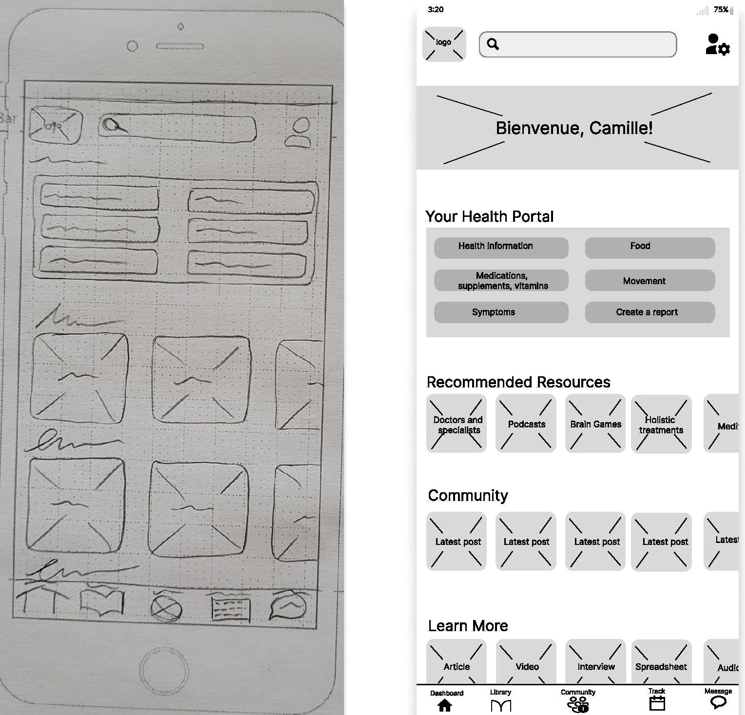 I quickly drew a few wireframes and then, moved to the next step in the design process: creating a low-fidelity prototype. This prototype would allow me to test the functionality and usability of the app in a more interactive and realistic way. In the following sections, we will take a closer look at the design and testing of the prototype, and how it helped us refine and improve Meno On the Go.